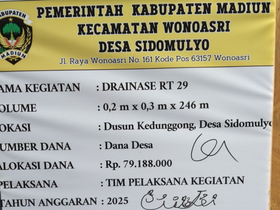 Kepada awak media, Sumadji selaku Kades Sidomulyo mengatakan pembangunan drainase tersebut menggunakan anggaran dana desa 2025. Nilainya, sebesar 79 jutaan.