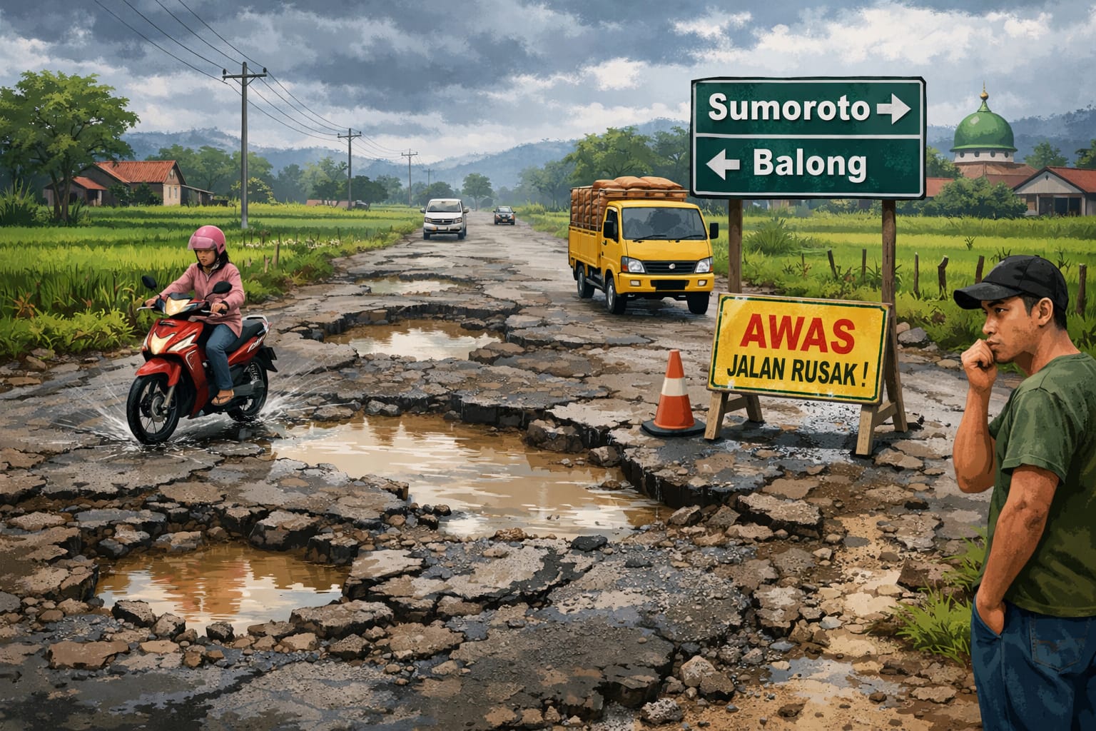 Kerusakan ruas jalan kabupaten penghubung Sumoroto–Balong, Ponorogo, kian memprihatinkan. Jalan vital yang menjadi akses utama ekonomi, pendidikan, dan penghubung antarwilayah itu dipenuhi lubang dalam yang membahayakan pengguna.