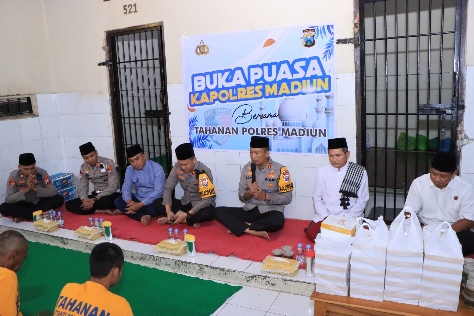 tendensius.com/, Madiun | Kapolres Madiun, AKBP Mohammad Zainur Rofik, S.I.K. didampingi oleh Pejabat Utama Polres Madiun, melaksanakan kegiatan buka puasa bersama dengan para tahanan di Rumah Tahanan (Rutan) Polres Madiun, Sabtu (8/3/2025).