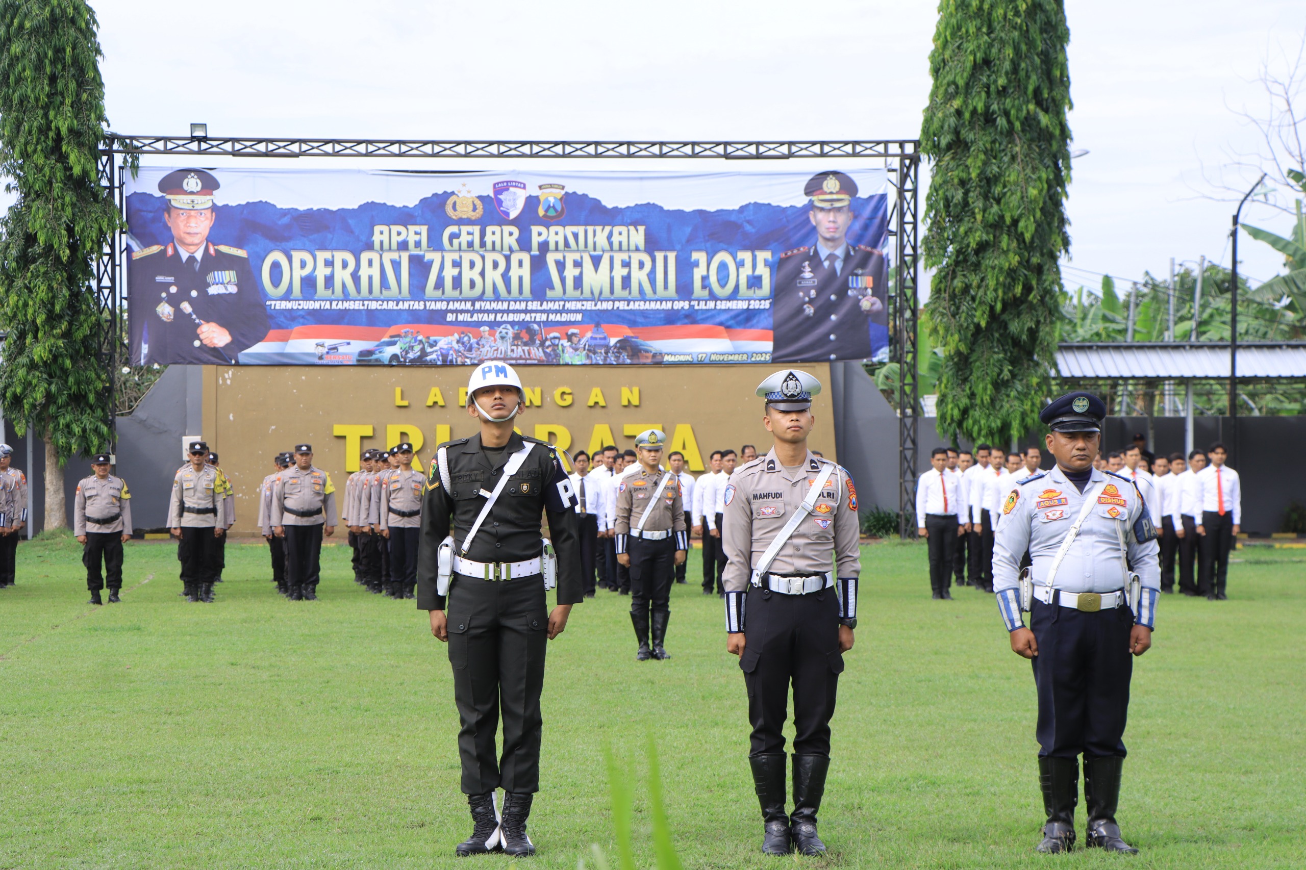Polres Madiun melaksanakan Apel Gelar Pasukan dalam rangka Operasi Zebra Semeru Tahun 2025, Senin (17/11/2025), bertempat di Lapangan Tri Brata Polres Madiun. Kegiatan dipimpin langsung oleh Kapolres Madiun, AKBP Kemas Indra Natanegara, S.H., S.I.K., M.Si., dengan mengusung tema “Terwujudnya Kamseltibcarlantas yang aman, nyaman, dan selamat menjelang Ops Lilin Semeru 2025 di wilayah Kabupaten Madiun.”