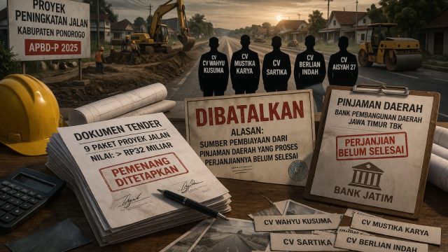 Dalam proses pengadaan pemerintah, ada satu tahap yang biasanya dianggap sebagai garis akhir: penetapan pemenang tender. Bagi kontraktor, momen itu bukan sekadar formalitas. Di situlah perusahaan mulai menyiapkan banyak hal: mobilisasi alat, rencana kerja, hingga pengaturan keuangan proyek. Namun di Ponorogo, sembilan paket proyek peningkatan jalan dengan total nilai lebih dari Rp32 miliar justru berhenti […]
