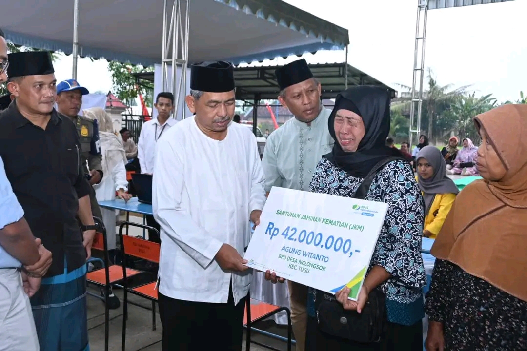 Hari ini kami juga menyerahkan kartu kepesertaan BPJS Ketenagakerjaan dari DBHJHT, sambung Adhie. “Kemudian pembiayaan dari Pemerintah Kabupaten Trenggalek. Kemudian juga klaim dari Toiran warga Banaran, Tugu sini yang meninggal. Beliau ini bukan pekerja penerima upah tapi penerima bantuan iuran DBHJHT dari Pemerintah Kabupaten Trenggalek di tahun anggaran 2024. Yang berikutnya dari BPBD Desa Nglongsor kepada ahli warisnya,” imbuhnya.